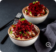 Crispy chicken pieces in sweet sauce served with beetroot and topped with green onion.